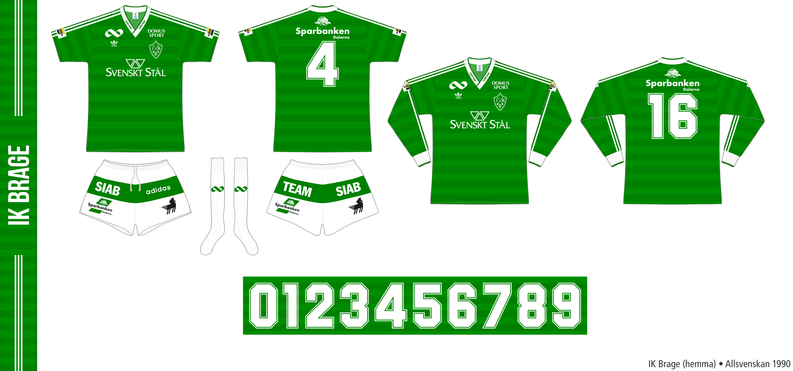 Adidas levererade matchställen till Brage 1990. Hemmatröjan hade gröna ränder på tvären samt vit V-hals och tre vita ränder längs ärmarna. Shortsen var vita med ett grönt fält runtom och strumporna var helvita. Reservstället gick i samma stil fast det var rött med vita detaljer. Huvudsponsor var Svenskt Stål. Andra logotyper som återfanns på matchstället var Domus Sport, ByggPaul, Sparbanken och Team Siab.