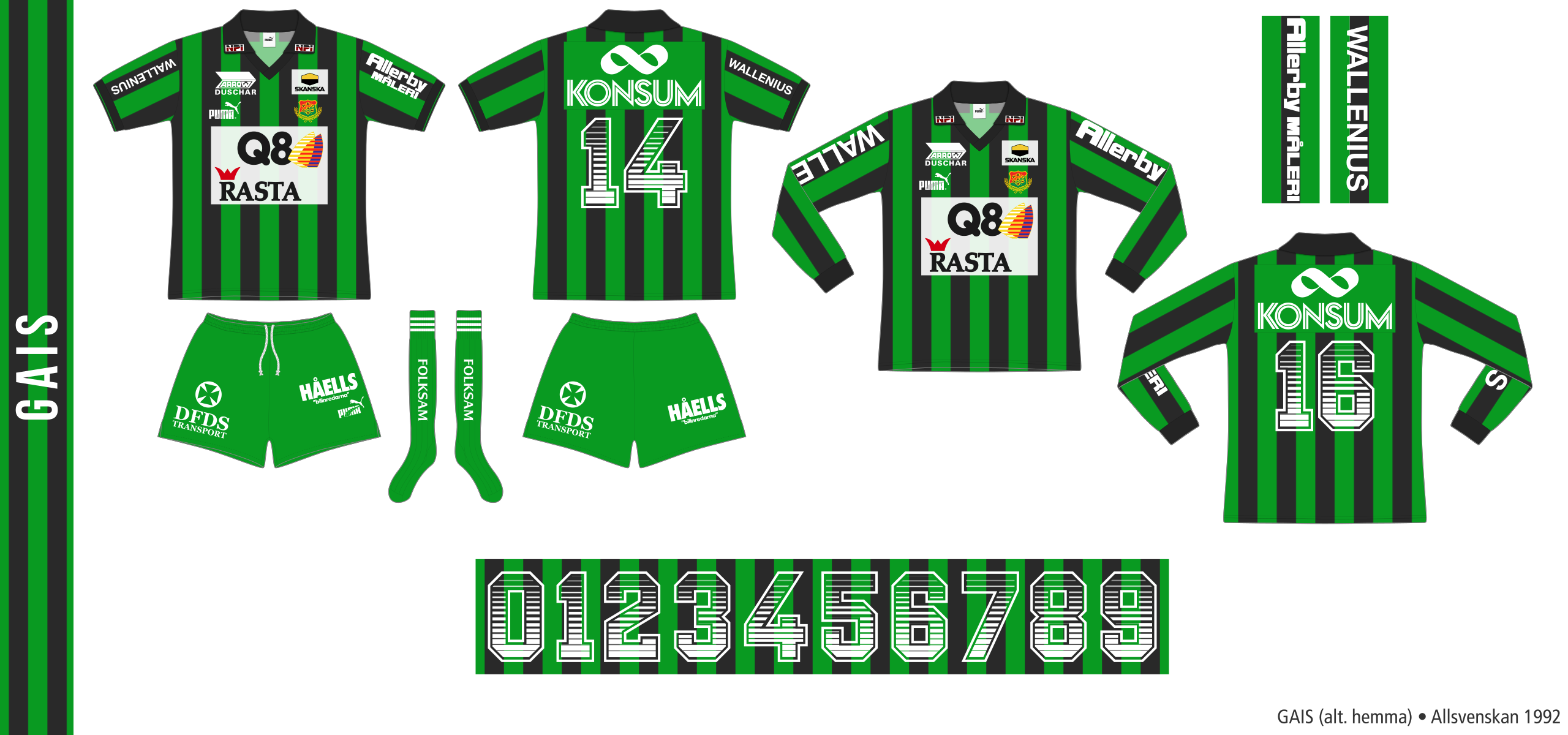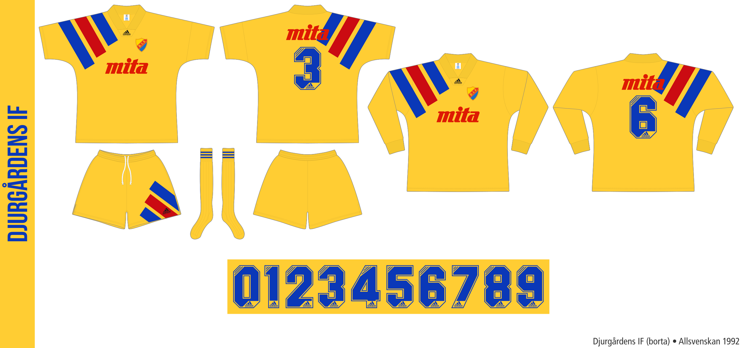 Bortatröjan var gul och hade den nya Adidas Equipment-designen ,med tre ränder över höger axel. I Djurgårdens fall var det två blå ränder och en röd. Denna bild på DIFarkivet.se är den enda jag hittat på bortatröjan. Min illustration nedan är därför bara en kvalificerad gissning gällande bortaställets shorts och strumpor.